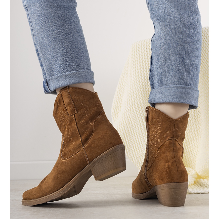 A parte superior é decorada com costuras sutis que enfatizam o caráter cowboy do calçado, e a clássica cor marrom camelo faz com que se adaptem perfeitamente a vários estilos - tanto do dia a dia quanto mais elegantes.