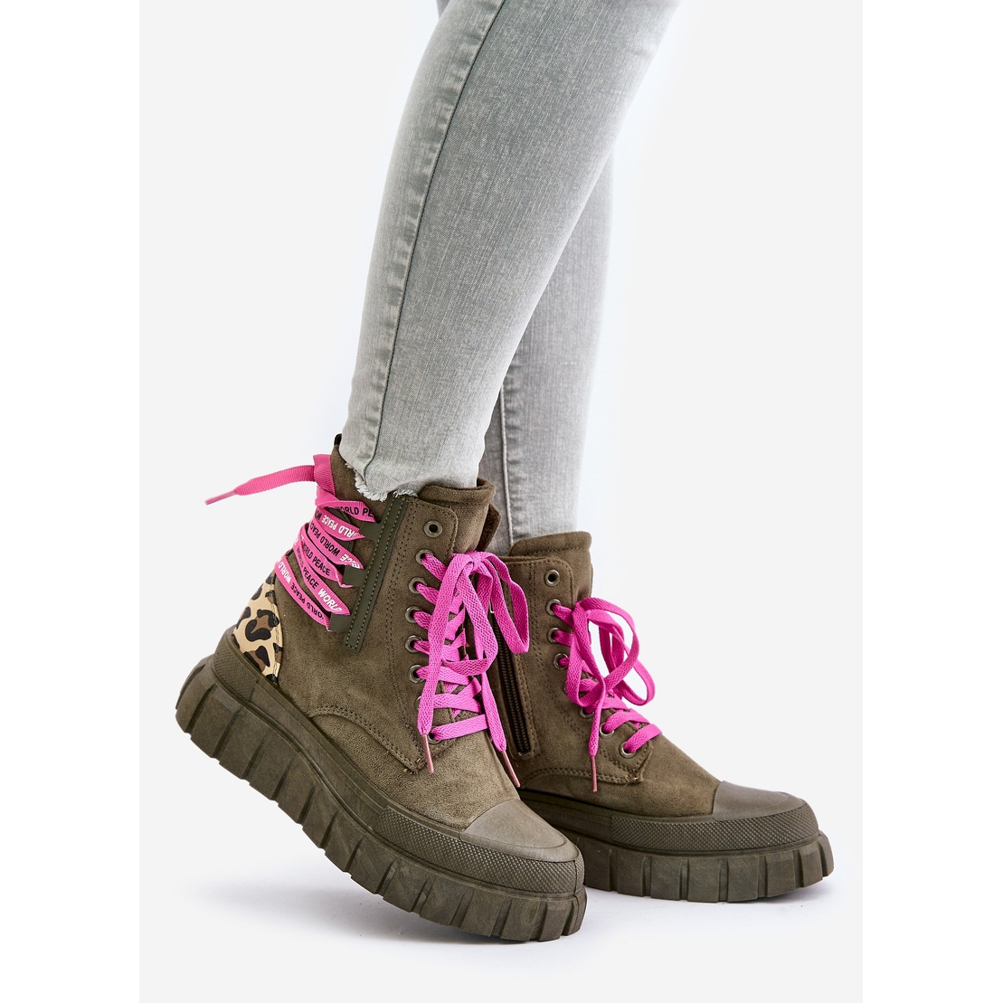 Descubra botas femininas elegantes e confortáveis na plataforma EDIDDA, que se distingue por um leopardo verde da moda. Esses sapatos exclusivos feitos de camurça ecológica combinam elegância e conforto, graças aos dedos dos pés arredondados e ao aquecimento na forma de um cobertor de calçados.