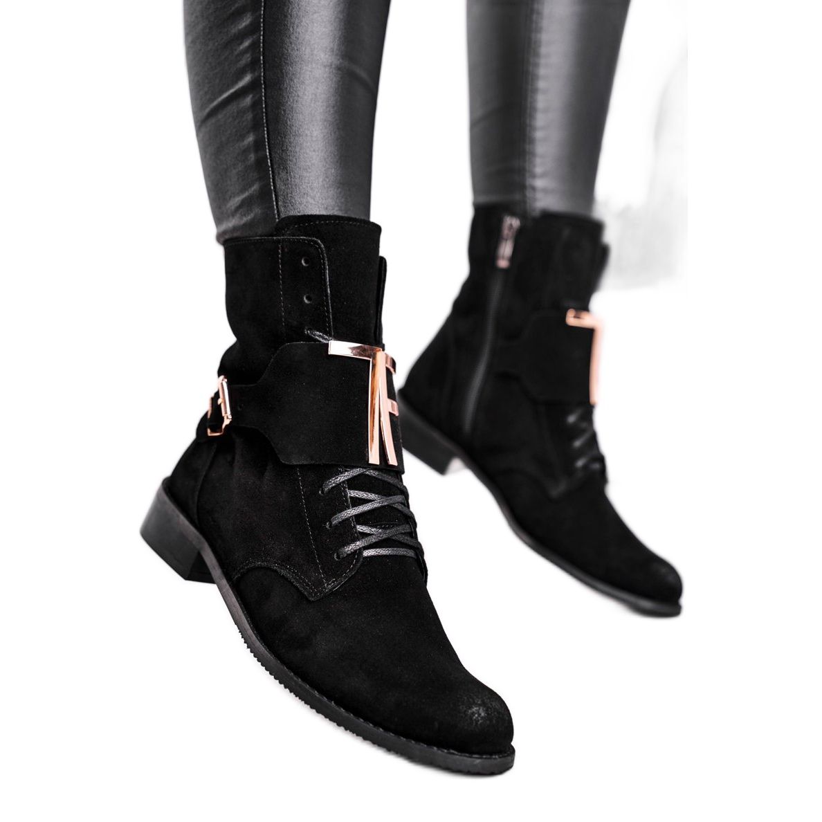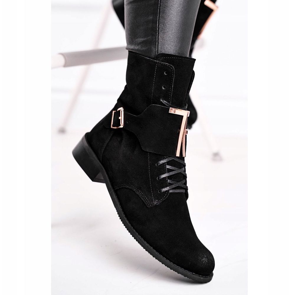 Graças à decoração em forma de fivela grande e letras douradas, as botas ganham um carácter único que se adapta perfeitamente às tendências da moda. A sua costura prática na lateral do fecho facilita a colocação e os atacadores adicionais permitem um ajuste perfeito à perna.