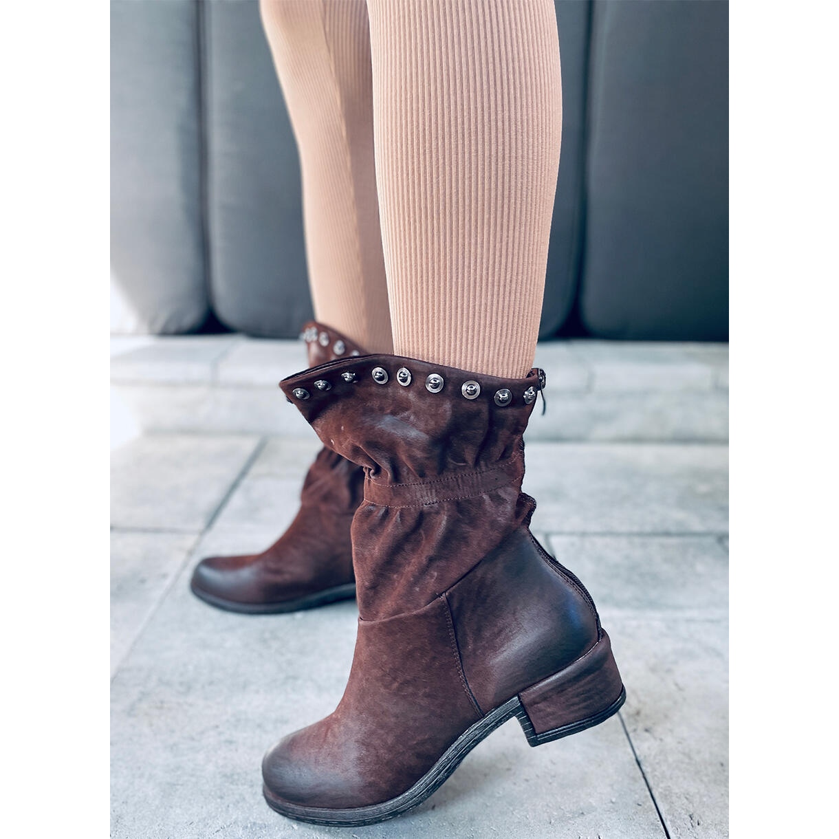 Descubra estilo e conforto únicos com os botins femininos Parri Brown! Estas botas militares com salto largo de 4,5 cm são a escolha perfeita para o uso diário, combinando design moderno com funcionalidade. A parte superior, sutilmente franzida e decorada com vistosas tachas, certamente chamará a atenção. O prático zíper na parte de trás torna extremamente fácil calçar e tirar os sapatos.
