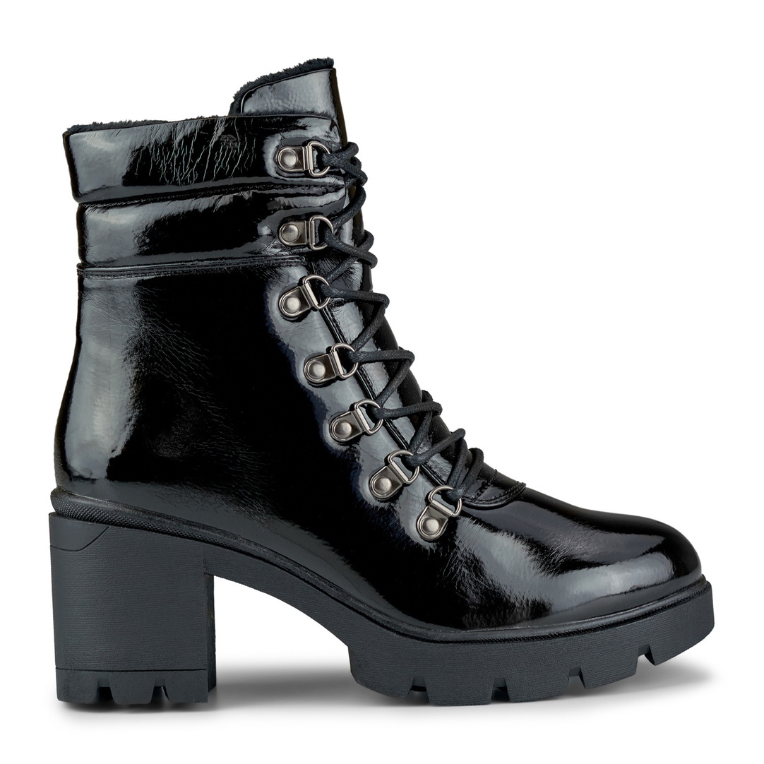 A superfície envernizada acrescenta estilo e caráter moderno, e o fechamento prático do zíper e o laço garantem um ajuste perfeito para o pé. O posto de 7 cm de altura garante estabilidade e conforto ao longo do dia, e o isolamento do Eco-Futra manterá o calor em dias mais frios. A sola sintética é leve e durável, ideal para o uso diário.