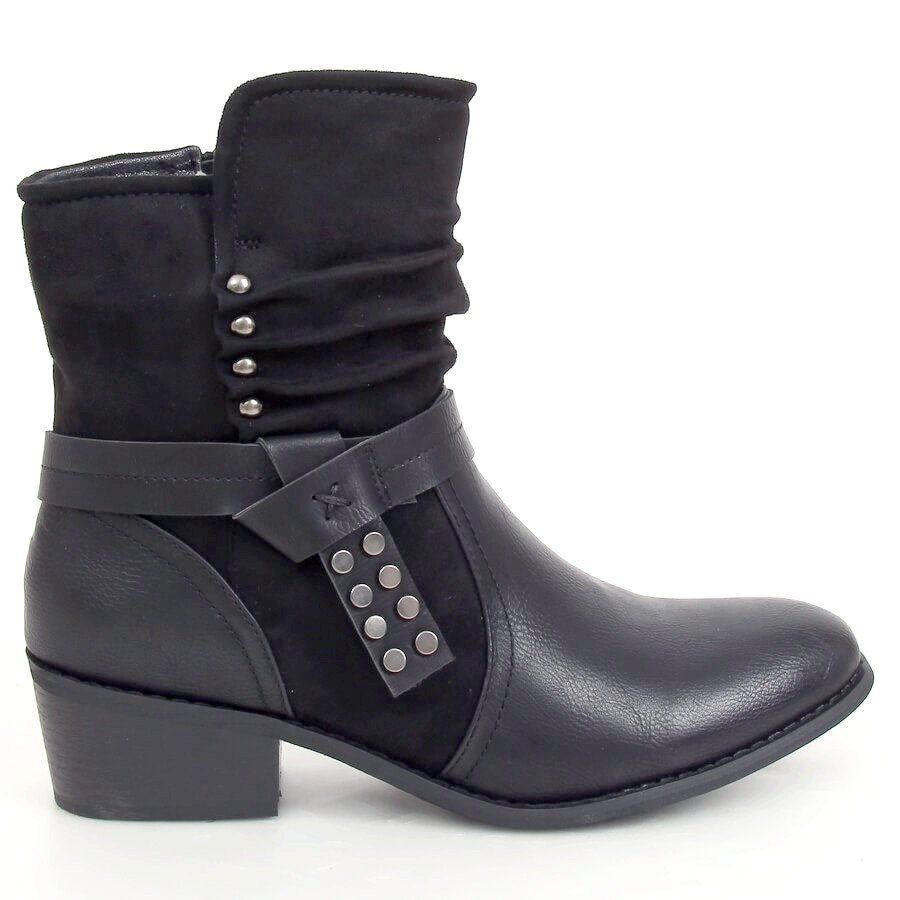 Descubra moda e conforto em um só lugar! Os botins femininos pretos Z1122 Black são a escolha perfeita para qualquer ocasião. Com salto largo de 4 cm de altura, proporcionam não só um look estiloso, mas também conforto para usar o dia todo. A parte superior franzida com tachas decorativas confere-lhes um carácter original, distinguindo-os dos restantes modelos.