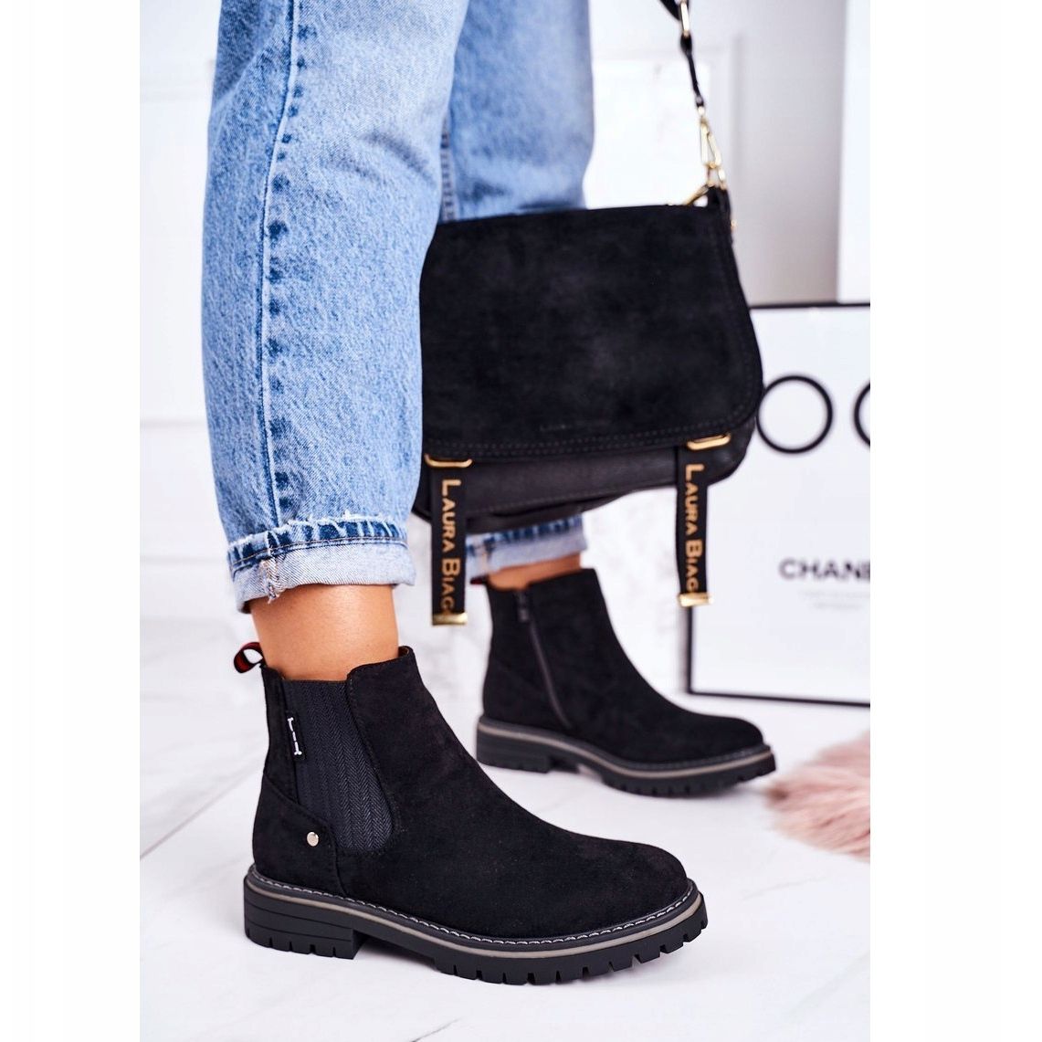Detalhes: PJ1 Botas femininas quentes Chelsea Botas pretas de camurça de viajante preto
