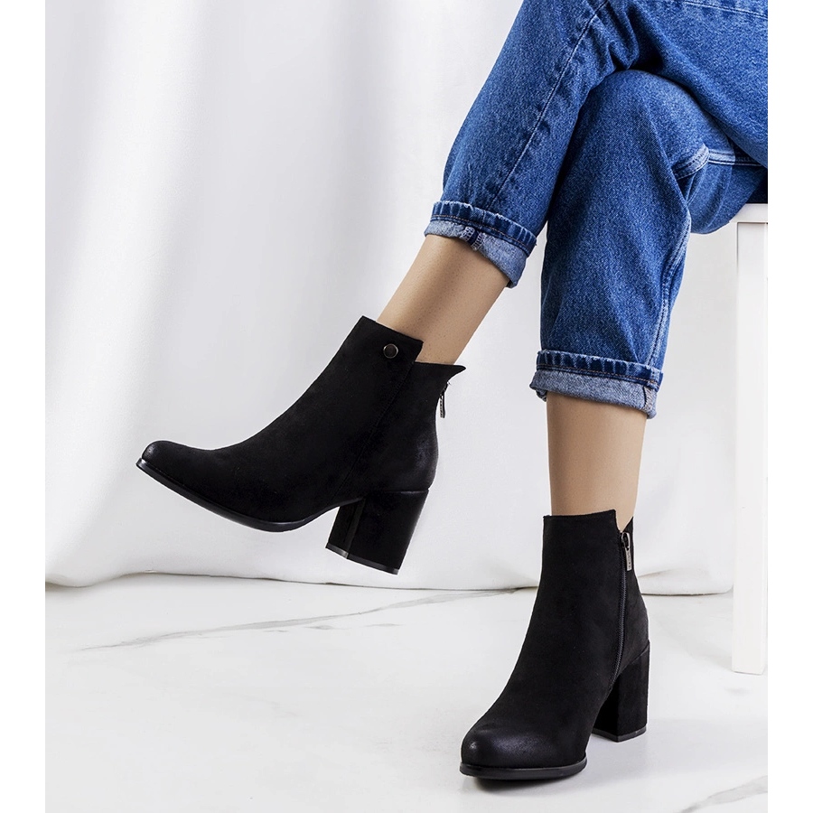 Botas elegantes e universais feitas de couro ecológico de camurça. Um modelo com um corte atemporal e esbelto (nariz Spitz) embutido em um post estável (bloco) com uma altura de 7 cm, buscando o tornozelo - ideal para estilizações diárias e noturnas.