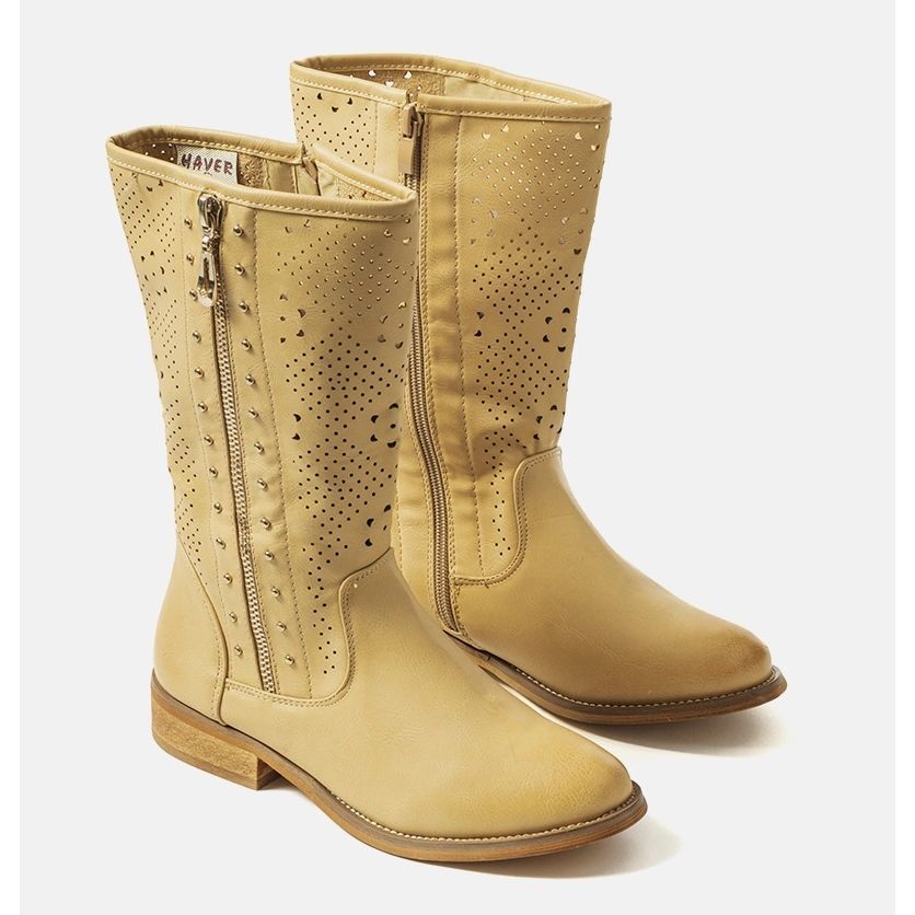 Botas delicadas e abertas em uma sombra bege são uma ótima opção para uma garota que gosta de conforto combinado com uma aparência elegante. A parte superior feita de couro ecológico com um padrão decorativo de trabalho aberto parece muito elegante e, ao mesmo tempo, oferece melhor ventilação - é por isso que os sapatos não estão isolados e funcionarão melhor na primavera.