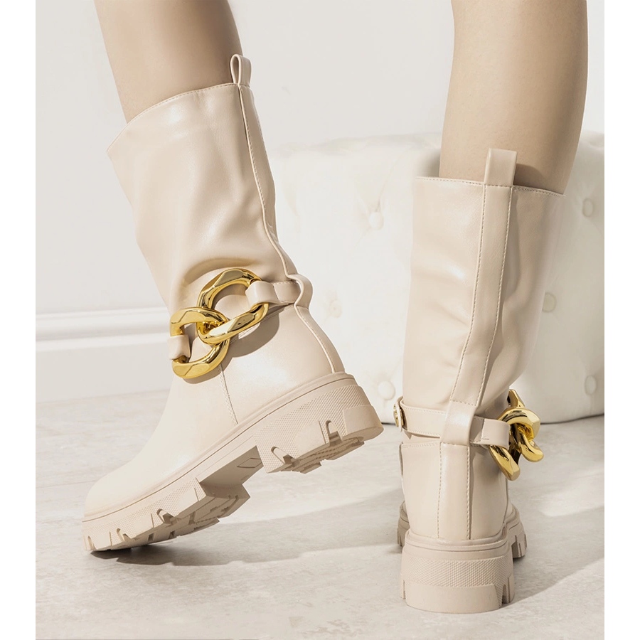As botas elegantes e bege harrison são uma combinação de um padrão único e elegante e um minimalismo atemporal. Feito de couro ecológico, com um pêlo macio e quente, garante o conforto, mesmo em temperaturas mais baixas. Uma corrente de ouro decorativa na barra ao redor do tornozelo adiciona o personagem e pode ser removido quando você preferir uma aparência mais moderada.
