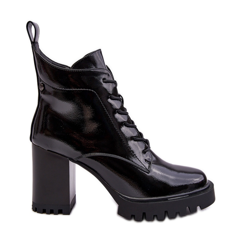 S. Barski Botas vacitadas nas calçadas isoladas de pilar - preto, elegante e prático para a temporada de outono/inverno. Feito de couro ecológico envernizado, colocado em um salto estável (8,5 cm), garanta uma certa etapa e uma aparência feminina. O interior está alinhado com um cobertor de aquecimento, graças ao qual os sapatos funcionarão em dias mais frios.
