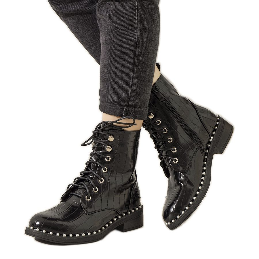 Descubra elegância e conforto com os botins com isolamento Nancy femininos pretos, que certamente se tornarão um elemento favorito do seu guarda-roupa. Estes sapatos únicos impressionam pelo seu acabamento cuidadoso, e a parte superior em couro ecológico com motivo de crocodilo confere-lhes um caráter elegante.