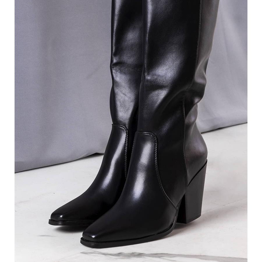 O modelo D7897 possui um salto em bloco estável de 9 centímetros que alonga opticamente as pernas e oferece uma caminhada confortável. A biqueira quadrada confere um visual atual e moderno, e a bota até o joelho oferece proteção adicional contra o frio.