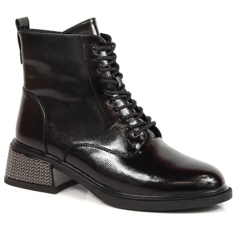 O modelo alto que chega acima do tornozelo proporciona suporte adequado e o salto plano de 4 centímetros confere elegância e autoconfiança sem abrir mão do conforto. A biqueira redonda confere um caráter clássico, e o acabamento laqueado e o salto decorativo chamam a atenção.