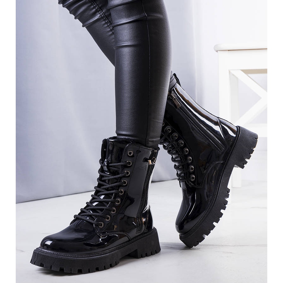 As botas estão disponíveis nos tamanhos 36 a 41 e têm largura superior de 12 cm, o que garante conforto no uso. Uma vantagem adicional é o acabamento lacado, que lhes confere um carácter elegante. Fechados com zíper e amarrados, ajustam-se perfeitamente ao pé, o que aumenta o conforto de uso.