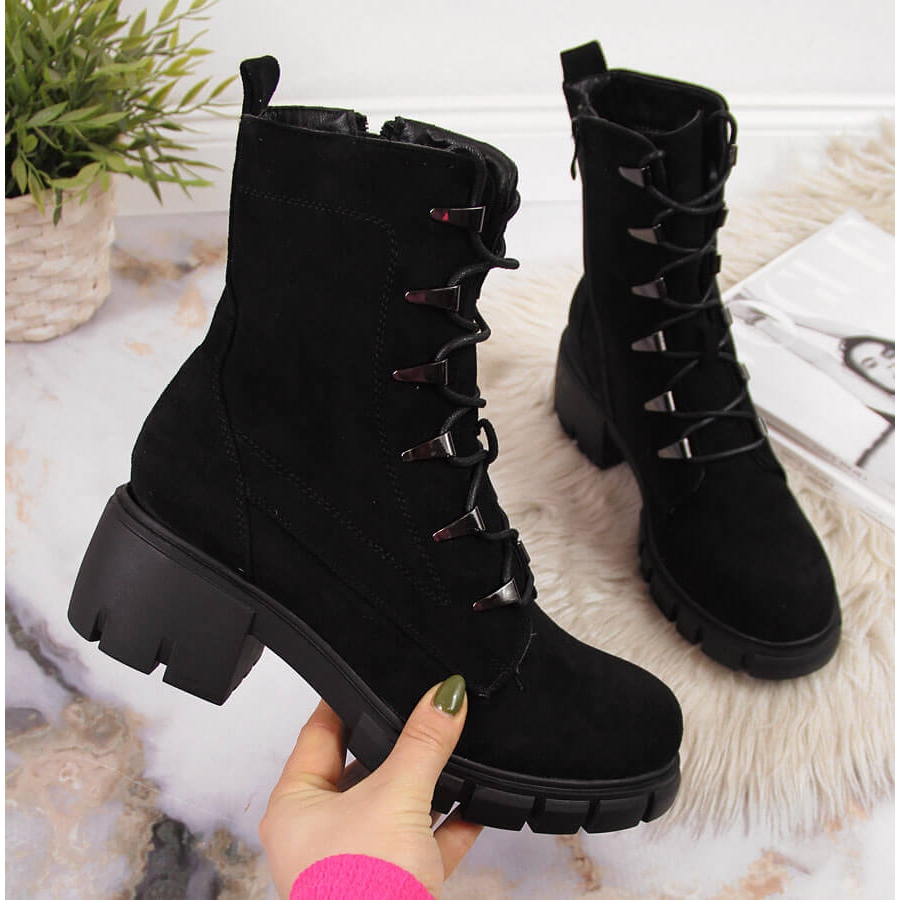Uma sola sólida e grossa com 2 cm de altura e um salto bloco com 6 cm de altura garantem estabilidade e absorvem perfeitamente cada movimento. A altura superior de aproximadamente 16,5 cm garante que o tornozelo estará adequadamente protegido contra o frio e a umidade. O couro ecológico com que são feitos os calçados é a escolha ideal para quem valoriza a moda ética. O look camurça confere às botas elegância e elegância.