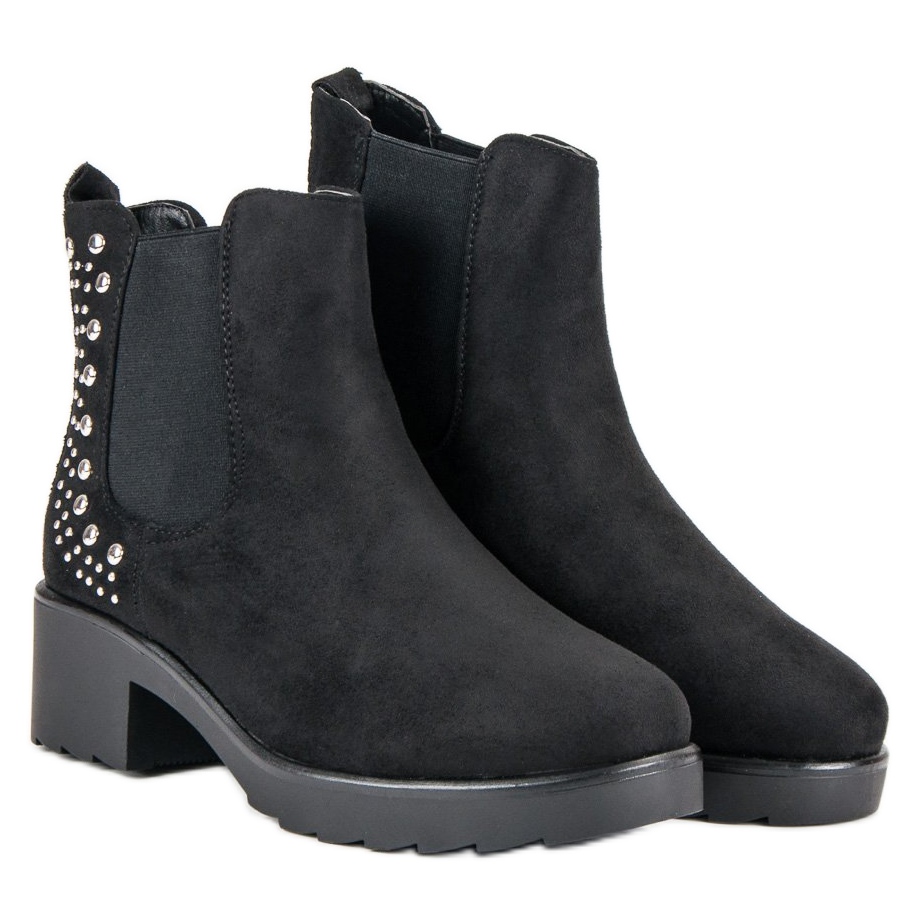 A elegante cor preta faz com que estas botas se encaixem perfeitamente em muitos estilos - tanto casuais quanto mais formais. Strass e tachas brilhantes conferem-lhes um carácter feminino e o salto de 5 cm de altura permite-lhe desfrutar de uma silhueta delicada sem sacrificar o conforto.