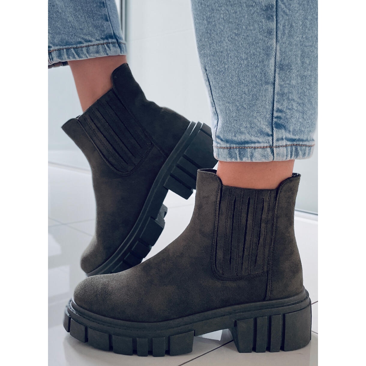 Apresentamos as botas femininas Leigh Green Chelsea em um tom moderno de verde cáqui, que são o complemento perfeito para qualquer estilo do dia a dia. Estes botins de camurça com sola grossa combinam elegância e conforto, sendo a escolha perfeita para diversas ocasiões.
