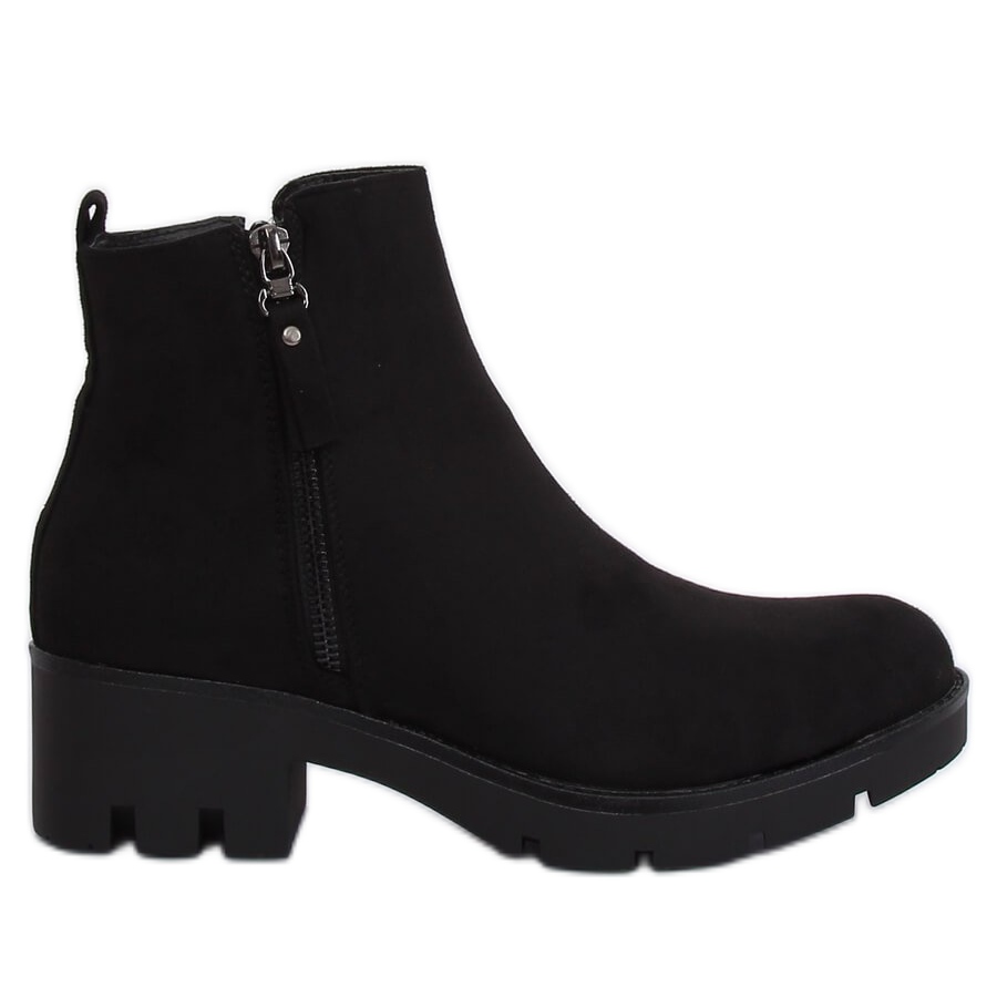 Confeccionados em camurça ecológica, os botins não só estão na moda, mas também são ecologicamente corretos. A biqueira redonda e o padrão liso enfatizam sua aparência elegante, e a cor preta os torna universais e podem ser facilmente combinados com vários itens de guarda-roupa.