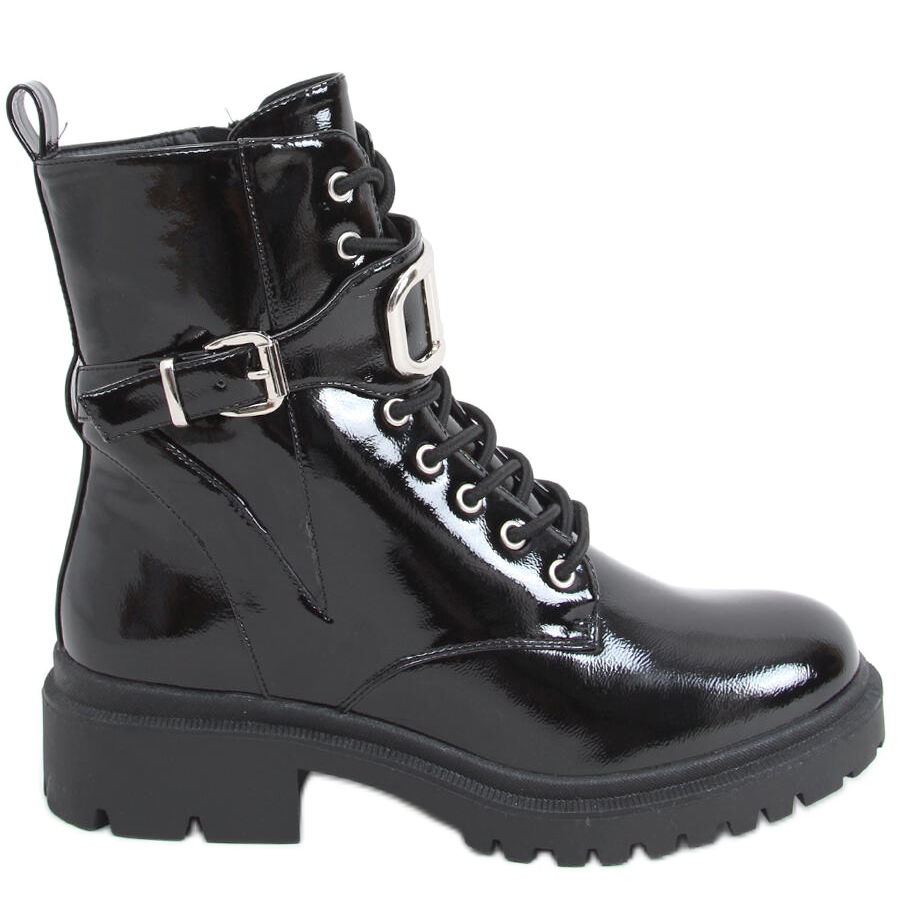 Estes são os botins envernizados Mila PATENT(BLACK) - a combinação perfeita de estilo, conforto e modernidade. Estes sapatos de trabalho pretos com sola alta distinguem-se pelo seu design clássico e acabamento lacado moderno, que acrescenta elegância. A atraente decoração prateada chama a atenção e torna todo o visual expressivo.