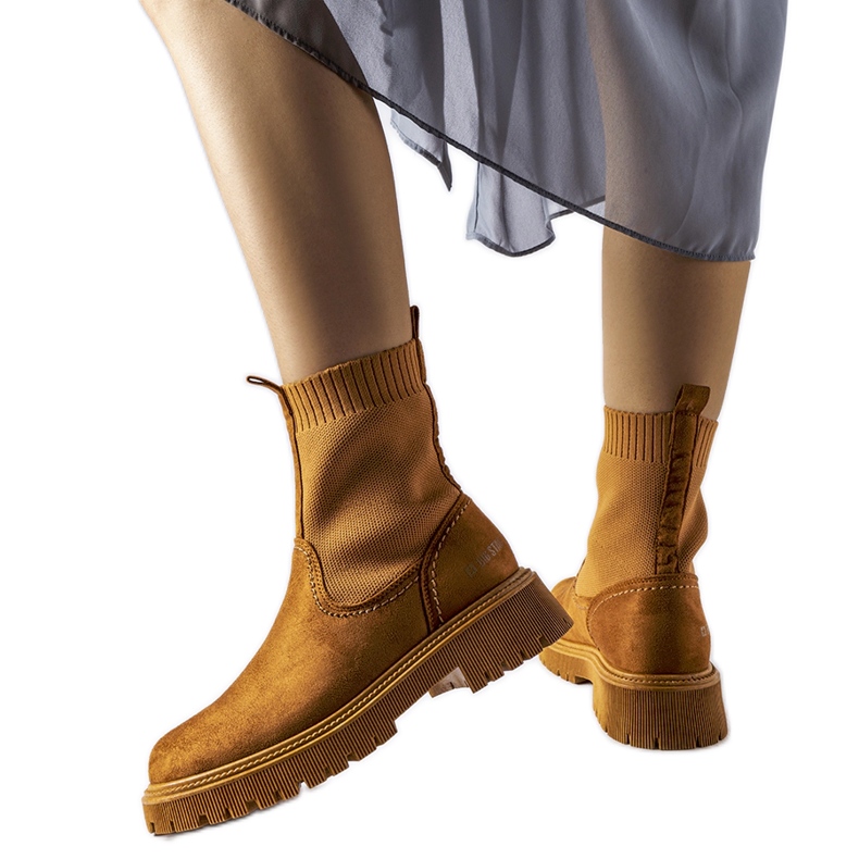 As elegantes botas de estrela feminina na sombra de camelo combinam uma aparência elegante com a funcionalidade. Feito de couro ecológico com textura de camurça, eles fornecem um personagem sutil e clássico e se misturam bem com muitas estilizações de inverno.