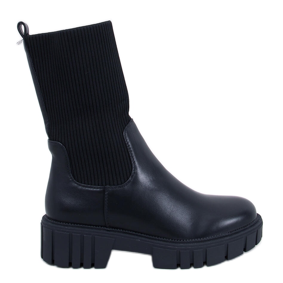 Botas modernas "meias" em uma plataforma estável (cerca de 2,5 cm), que combinam perfeitamente uma aparência elegante com o conforto diário. A parte superior elástica e combinando de tecido envolve a panturrilha e os elementos do couro ecológico enfatizam o caráter elegante do sapato. Modelo isolado - uma excelente opção para dias mais frios.