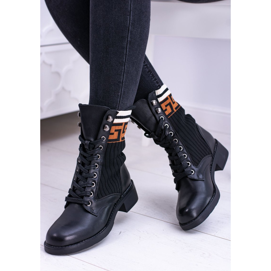 Têm bico redondo clássico e fecho com cadarço, o que os torna práticos e fáceis de calçar. A altura superior é de 19 cm, o que protege bem os tornozelos do frio e ao mesmo tempo continua a ser um destaque da moda.