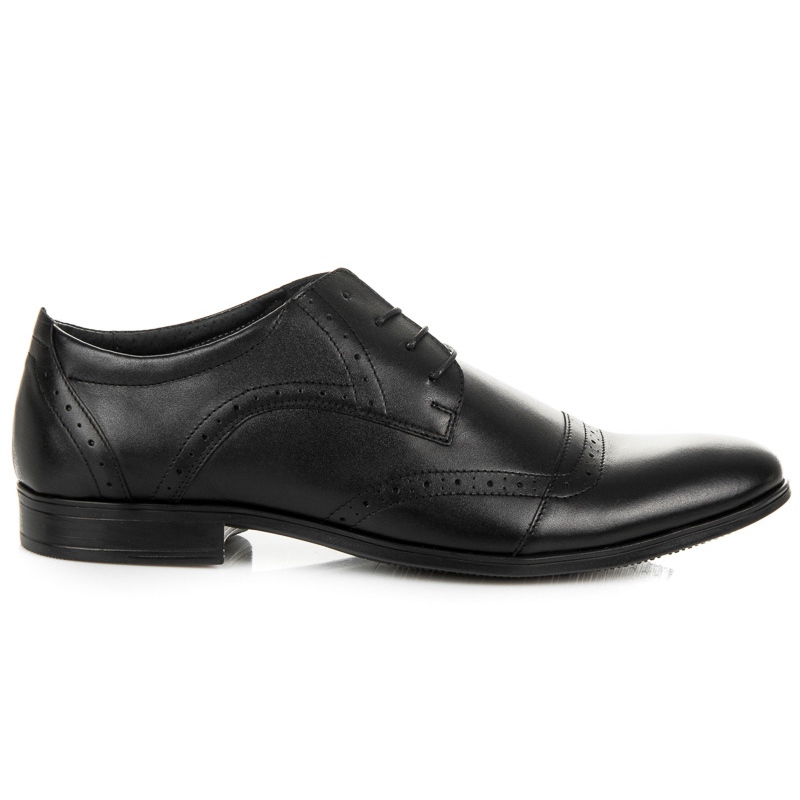 Lucca - calçado masculino em versão clássica e elegante. O couro natural preto, liso e o corte atemporal fazem com que o modelo combine perfeitamente com um terno e outros estilos elegantes. Graças à sola de plástico plana e estável, os sapatos proporcionam um caminhar confortável e permitem dançar durante longas horas.
