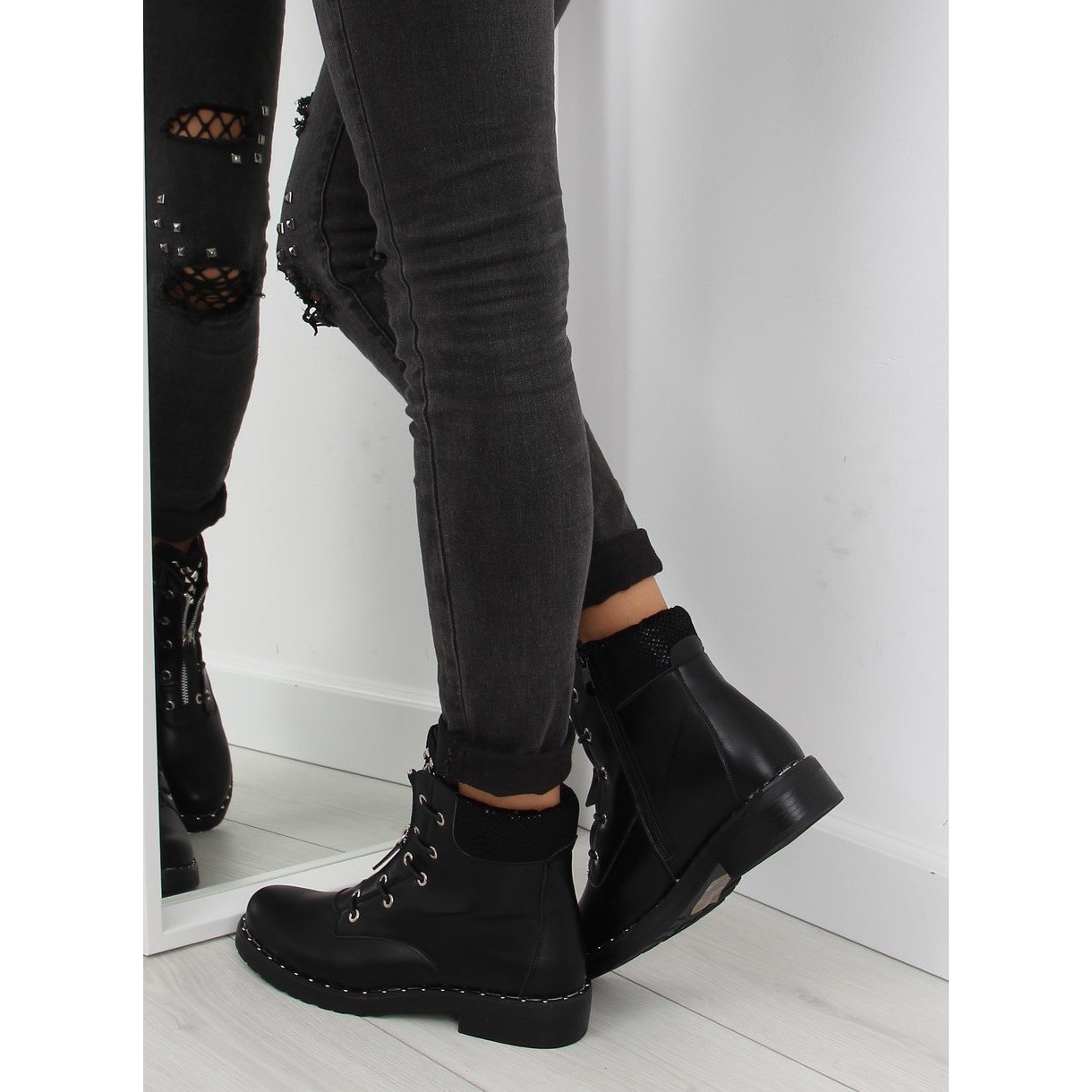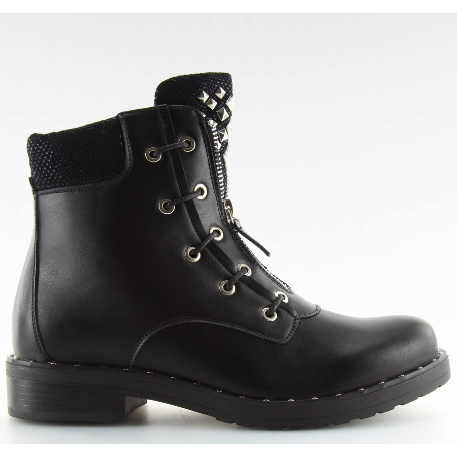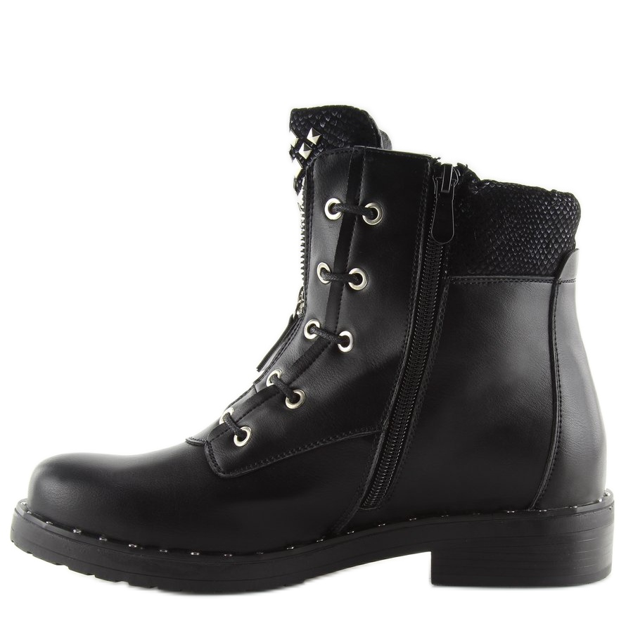 Descubra um estilo único com as botas militares pretas BH82-KB pretas! Estas botas femininas exclusivas em estilo grunge são um item obrigatório para todas as mulheres elegantes. Seu elemento decorativo distintivo é uma língua cravejada que adiciona um caráter rock e um zíper prateado que lhes confere um visual moderno.