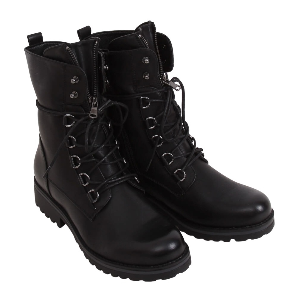 BZ66017-KB As botas militares pretas são obrigatórias em todas as coleções de moda! Estes botins femininos com atacadores combinam conforto e estilo, combinando perfeitamente com as tendências atuais. Graças ao seu design atemporal com sola com protetor, estes sapatos proporcionam segurança e um visual moderno.