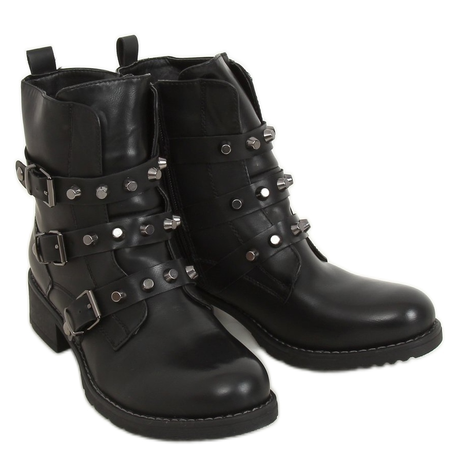O couro ecológico preto com que são confeccionados é garantia de durabilidade e conforto, e o interior do calçado é forrado com pele delicada e aumenta o conforto de uso, tornando-o perfeito mesmo nos dias mais frios. Decorações adicionais em forma de tiras decoradas com strass e tachas conferem às botas um caráter único, tornando-as um complemento perfeito para estilos rock.