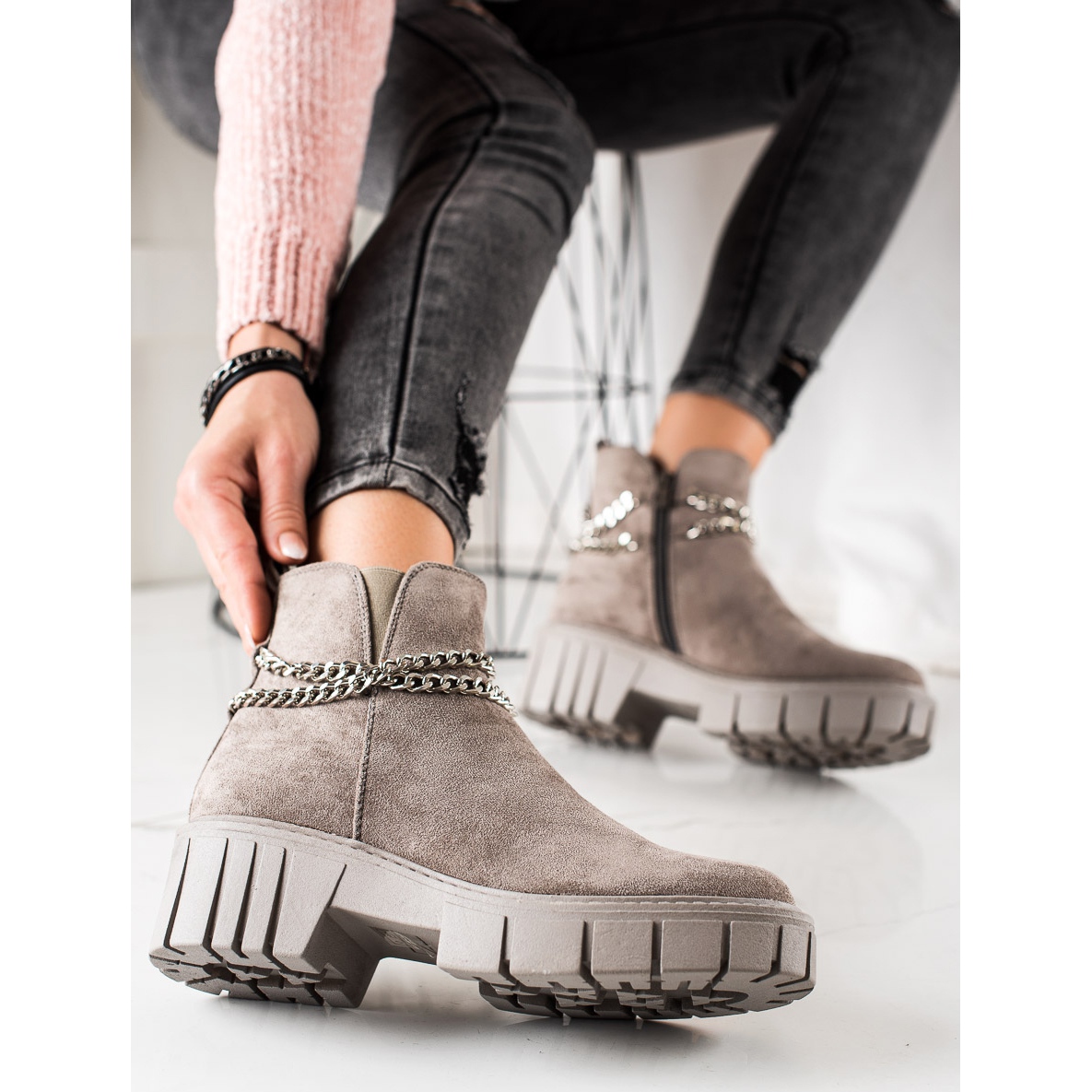 Conheça as botas plataforma Goodin, que combinam perfeitamente conforto com estilo fashion! Na cor bege (taupe), estes elegantes sapatos femininos são a escolha perfeita para os dias mais frescos de outono e inverno. Feitos de couro camurça ecológico de alta qualidade, eles têm uma aparência excepcionalmente atraente e seu interior em tecido elástico garante conforto de uso.