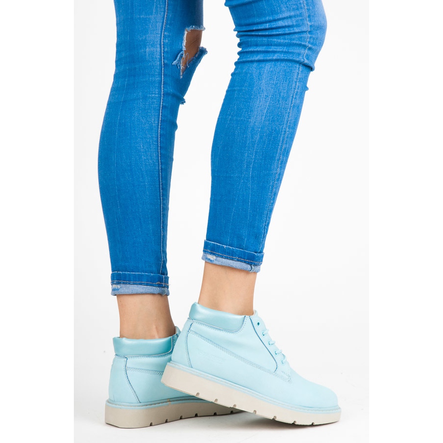 Os botins plataforma Vices são a escolha perfeita para mulheres que valorizam conforto e estilo casual. Estes lindos sapatos azuis claros são confeccionados em couro ecológico, o que os torna não só na moda, mas também ecologicamente corretos. Uma pequena plataforma de 3 cm de altura acrescenta alguma altura ao mesmo tempo que garante estabilidade ao caminhar.