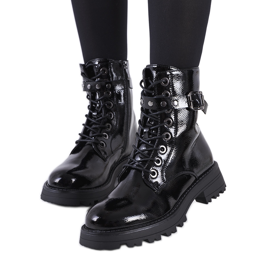 Os trappers elegantes e negros de Narnclaedra combinam um visual elegante e envernizado com a praticidade de calçados casuais. As botas alcançam o tornozelo, têm um nariz arredondado e são incorporadas em uma sola grossa e protegida (cerca de 5 cm de altura), o que garante boa adesão e estabilidade. O fixador de zíper colocado por dentro facilita a instalação e a ligação frontal dá a possibilidade de combinar a parte superior. Uma decoração sutil é um cinto de prata. O interior está isolado, o que a torna a escolha perfeita para a temporada de outono/inverno.