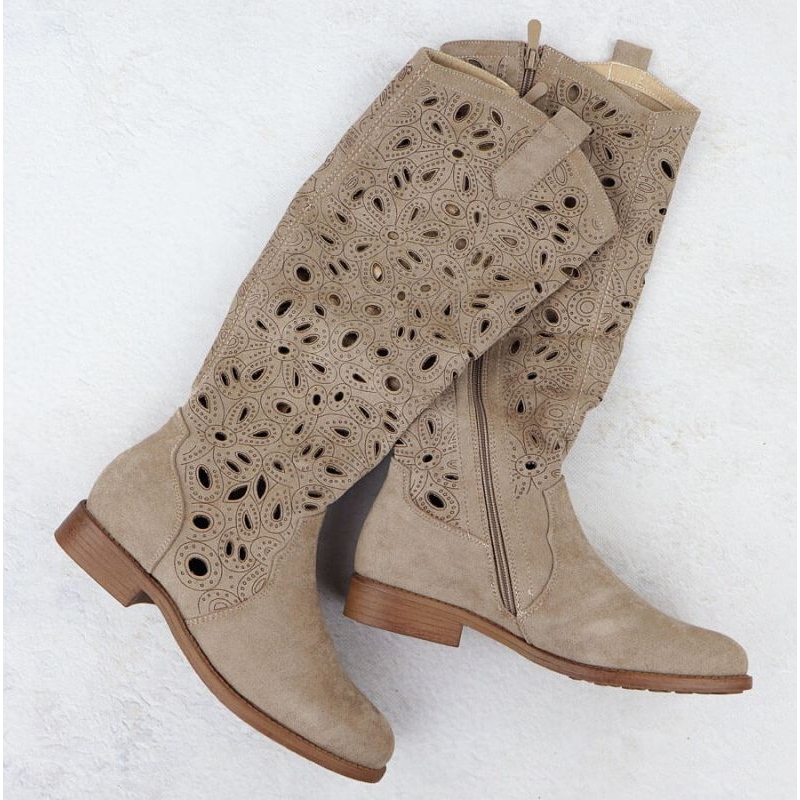 As botas dos cossacos foram feitas de couro ecológico de camurça, o que não apenas enfatiza seu caráter elegante, mas também garante conforto o dia todo. As decorações abertas adicionam leveza e originalidade, fazendo com que cada estilização ganhe um charme único.
