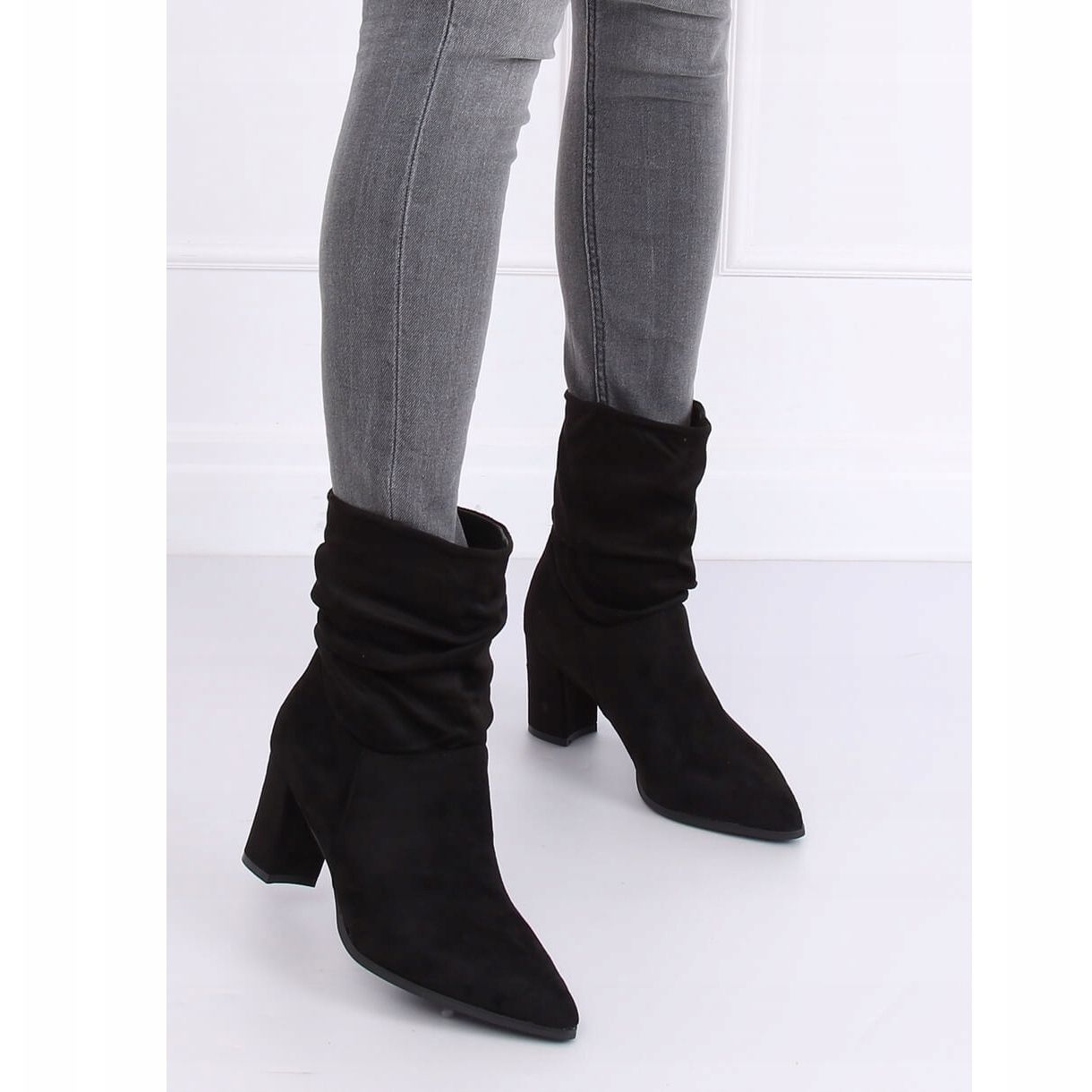 Preto 5582 Os botins pretos com cano caído são a escolha perfeita para mulheres que valorizam elegância e conforto. Estas botas bem torneadas com salto estável de 7,5 cm combinam perfeitamente o design clássico com o estilo moderno. Confeccionados em camurça ecológica, caracterizam-se por um cabedal elegantemente enrugado e largo, que garante conforto na hora de calçá-los.