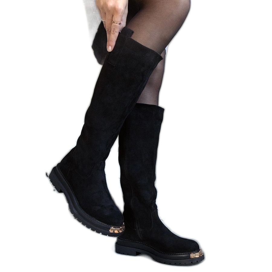Descubra as botas pretas incomuns com um acabamento de metal Guillor, que é um must-have no guarda-roupa de todas as mulheres da moda. Feito de couro ecológico de camurça de alta qualidade, essas botas se deleitam com o design e funcionalidade modernos. Um nariz redondo e uma plataforma de 4,5 cm de altura adicionam não apenas estilo, mas também conveniência todos os dias.