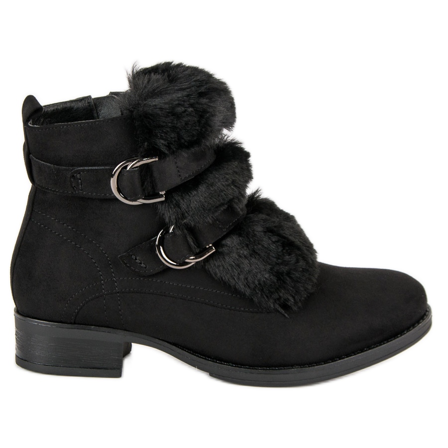 As botas pretas com pêlo têm bico redondo e fecho de zíper, o que facilita a colocação e a retirada. As tiras decorativas com fivelas prateadas enfatizam ainda mais o seu estilo único. O salto leve de 3,5 cm torna o calçado confortável para usar o dia todo, independente da ocasião.