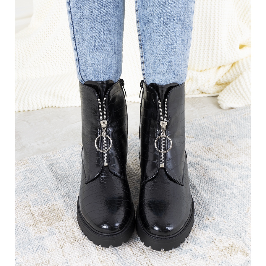 A parte superior da moda das botas é decorada com um zíper falso, o que lhes confere um caráter original e as torna excepcionalmente elegantes. A sola alta e trapper é um must-have entre as tendências contemporâneas, garantindo conforto e estabilidade no uso.