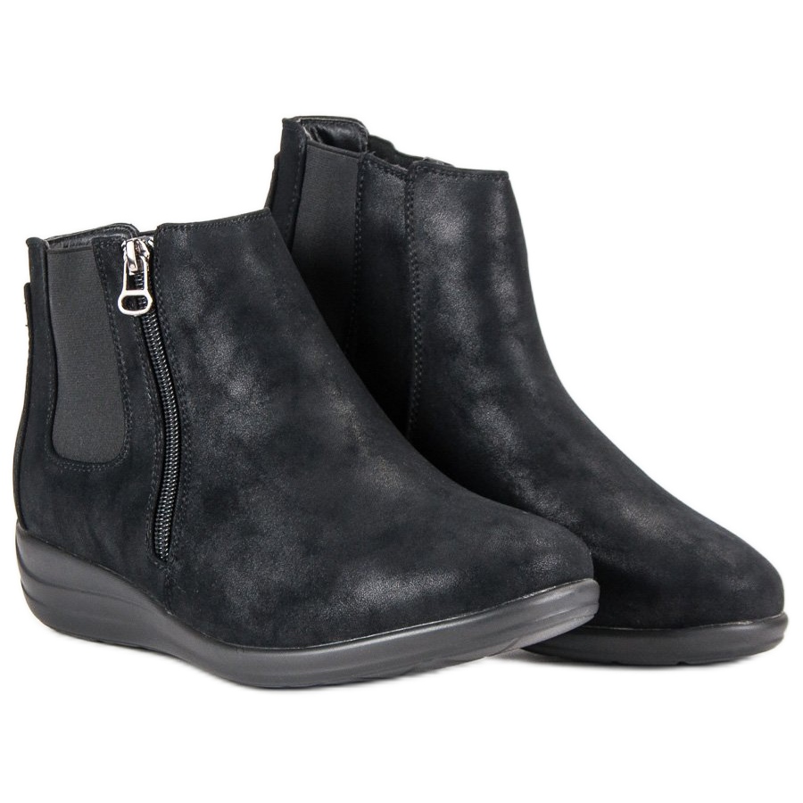 Confeccionadas em couro camurça ecológico de alta qualidade, as botas garantem durabilidade e visual atraente. O isolamento interno torna-os uma solução perfeita para os dias de inverno, e uma pequena plataforma de cunha de 4 cm de altura garante um uso confortável.