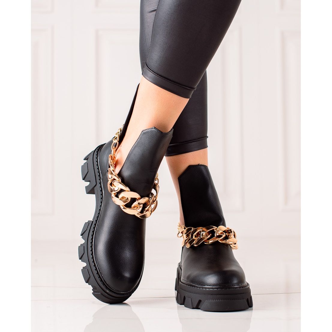 Confeccionadas em imitação de couro de alta qualidade, as botas são caracterizadas por salto reforçado e macio e bico redondo, o que as torna confortáveis para usar o dia todo. A corrente de ouro colocada na parte superior torna-os atraentes e um elemento não muito trivial de qualquer estilo.