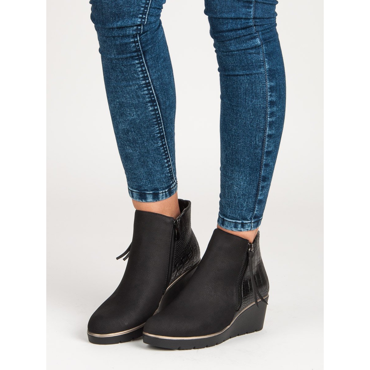Descubra a combinação perfeita de estilo e conforto com as botas pretas de cunha da Filippo. Esta é uma proposta perfeita para mulheres que valorizam elegância e funcionalidade no calçado do dia a dia. Feitos de couro ecológico de alta qualidade, estes botins não só têm uma ótima aparência, mas também são ecologicamente corretos.