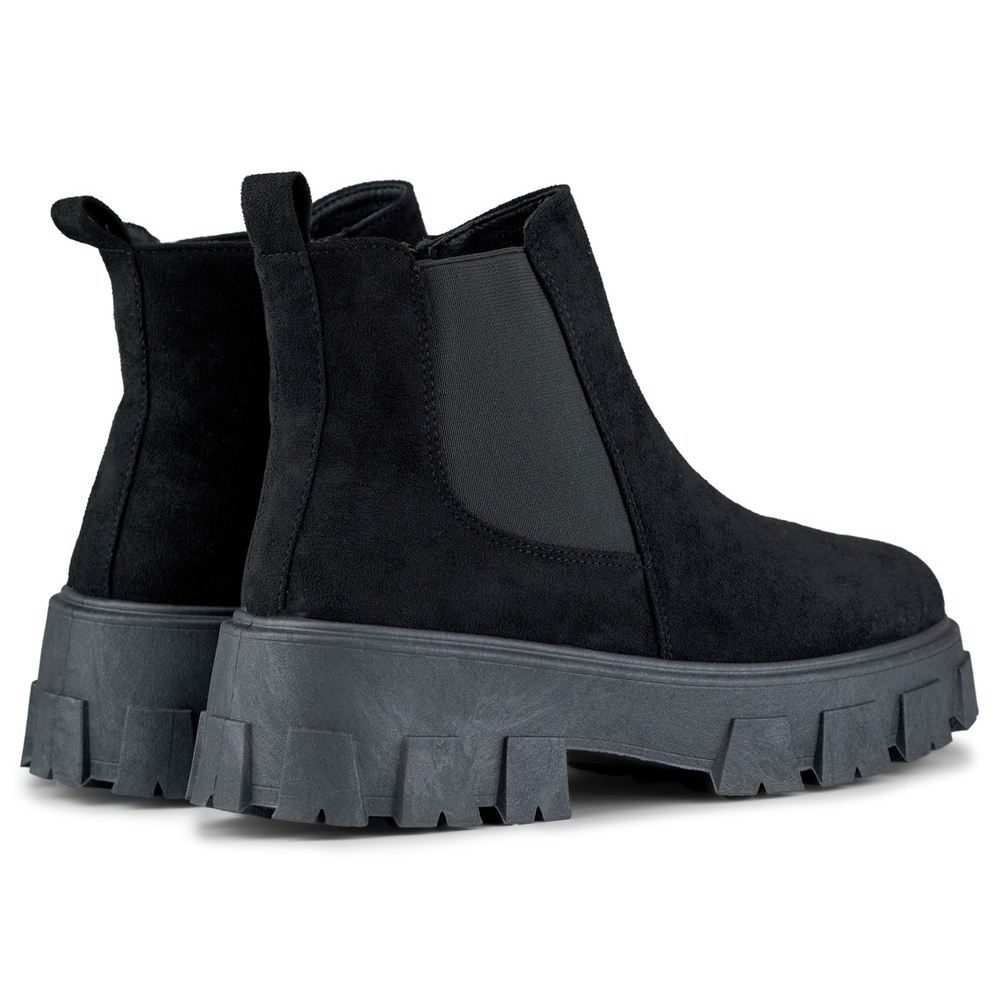 Os botins femininos pretos com sola grossa são a escolha perfeita para os dias mais frios. Feitos em camurça ecológica, têm um aspecto elegante e moderno, acrescentando personalidade a qualquer estilo. Sua biqueira clássica e redonda e cano alto acima do tornozelo garantem não apenas um visual moderno, mas também conforto de uso.