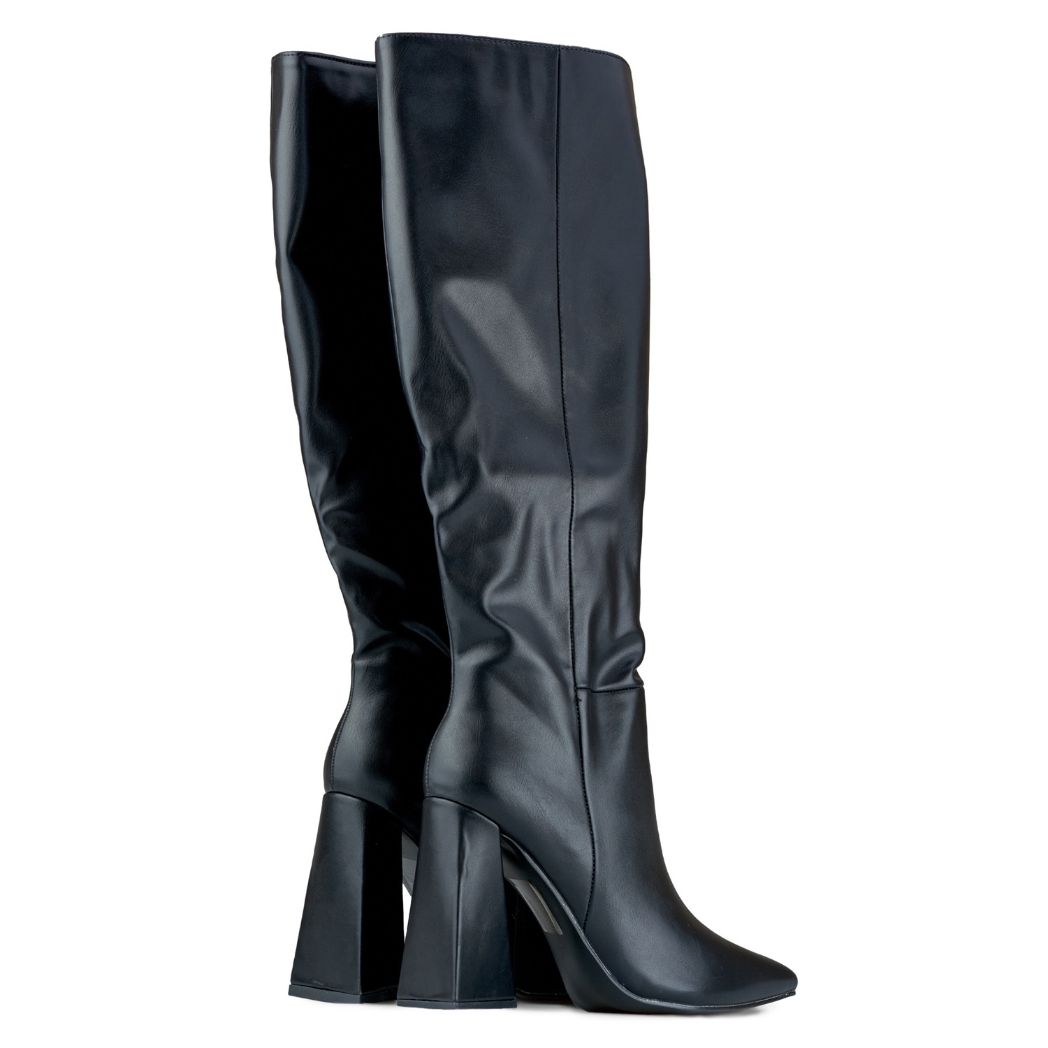 Detalhes: Botas pretas de salto alto feitas de couro ecológico preto