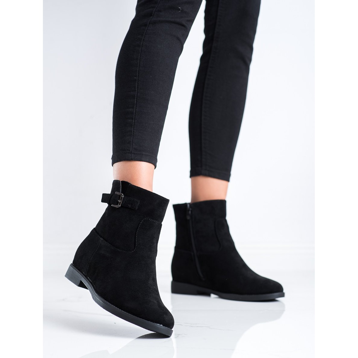 A cunha oculta de 5 cm de altura acrescenta alguns centímetros de altura, garantindo estabilidade e conforto ao caminhar. Um zíper lateral torna fácil e rápido calçar e tirar os sapatos. Além disso, a fivela decorativa chama a atenção e confere às botas um caráter único.
