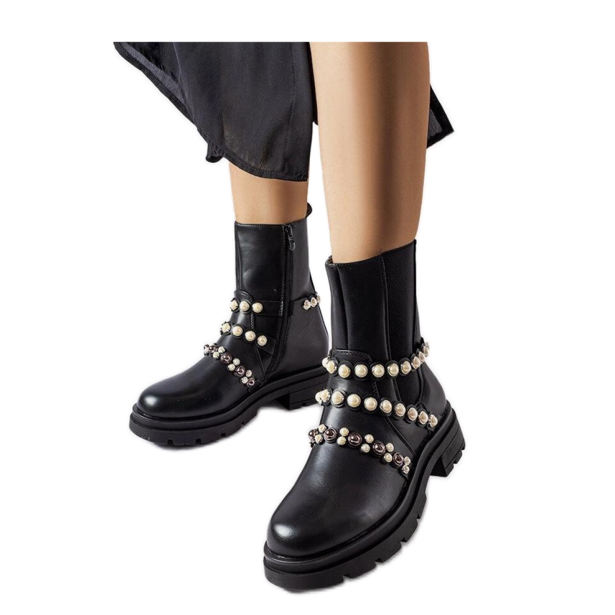 Botas pretas decoradas com pérolas são uma ótima opção para mulheres que procuram elegância e conforto no estilo de inverno. Seu design moderno, uma combinação de couro ecológico de alta qualidade e decorações sutis na forma de pérolas, lhes dá um personagem único. As botas têm um salto plano de 4,5 cm de altura prático, mas elegante, o que garante estabilidade e conforto de usar o dia todo.