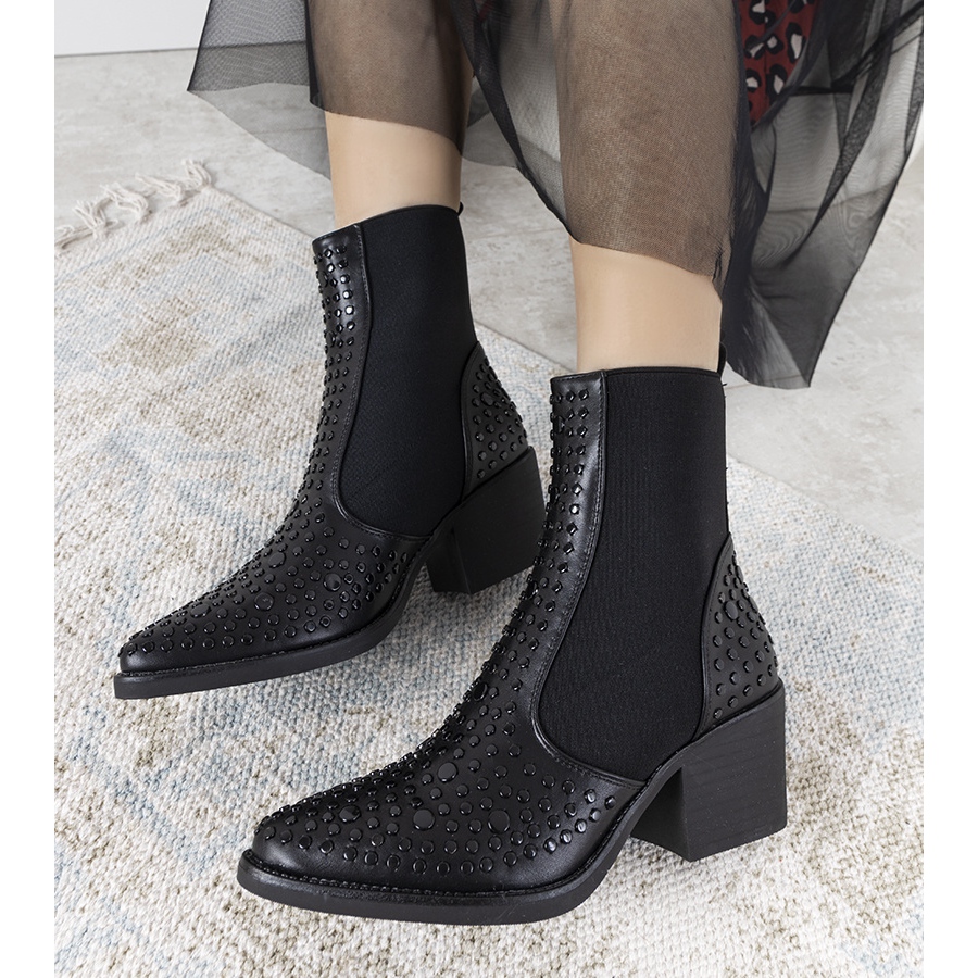 Graças aos strass decorativos pretos, os botins Camus se destacam dos demais modelos, chamando a atenção e dando um toque especial a todo o estilo. A ponta pontiaguda e a parte superior justa estreitam opticamente as pernas, o que os torna a escolha perfeita para várias ocasiões - desde reuniões casuais até passeios elegantes.