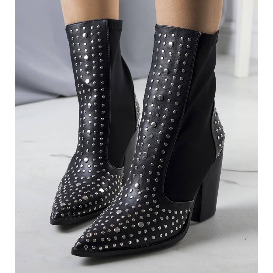 Botas fenomenais e uma combinação de caráter rochoso e elegância feminina. O modelo no posto (9,5 cm) tem um nariz pontudo e atinge o tornozelo (altura da parte superior cerca de 25,5 cm). A parte superior feita de couro ecológico de alta qualidade no clássico preto foi decorado com pregos de metal que lhes dão uma aparência expressiva e elegante.