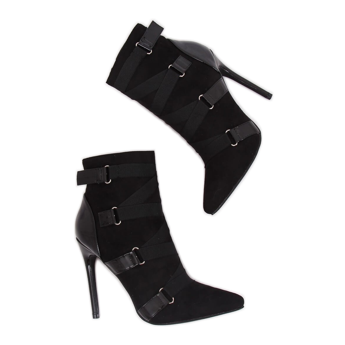 O modelo é caracterizado por uma delicada biqueira pontiaguda e impressionantes tiras que se cruzam na frente, que agregam sofisticação ao conjunto. Confeccionadas em camurça ecológica, as botas também possuem detalhes em couro envernizado, o que as torna não só elegantes, mas também duráveis. Graças ao isolamento em forma de forro de espuma, você poderá desfrutar não só de estilo, mas também de conforto ao usar.