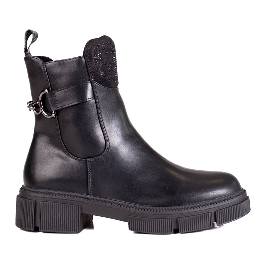 As botas femininas negras elegantes em uma plataforma leve, perfeitas para a temporada de outono/inverno. Feito de couro ecológico, com uma inserção de pêlo isolada e um forro têxtil, combine design casual da moda com funcionalidade cotidiana. Decorações delicadas na forma de zircões e um personagem de adição de cadeia, sem desistir da universalidade.