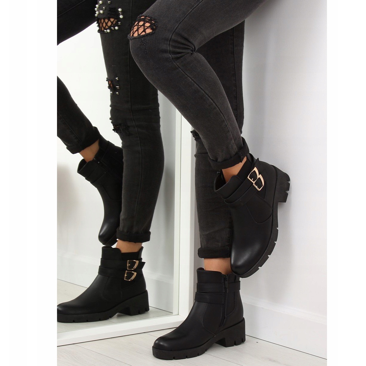 Oferecendo estabilidade graças ao salto largo de 5 cm de altura e plataforma de 2 cm, os botins garantem conforto mesmo quando usados por longos períodos de tempo. Uma sola mais grossa e presa combinada com o preto clássico torna estes sapatos um complemento perfeito para muitos estilos. Além disso, as fivelas douradas conferem-lhes um carácter ligeiramente rock, que certamente irá agradar aos amantes do estilo expressivo.