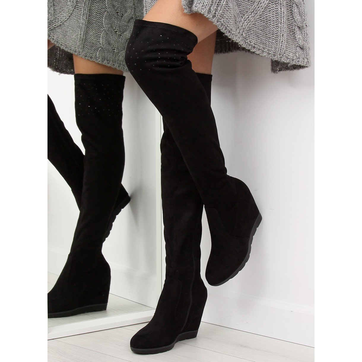 Descubra estilo e elegância únicos com o mosqueteiro de cunha K-59 na clássica cor preta. Estes deslumbrantes sapatos femininos, desenhados a pensar na mulher moderna, combinam perfeitamente moda com conforto. O cano alto que chega acima do joelho, decorado com pedras sutis, não só emagrece a figura, mas também confere elegância a qualquer estilo.
