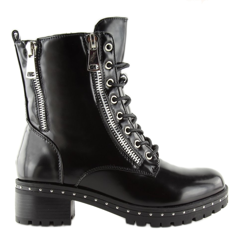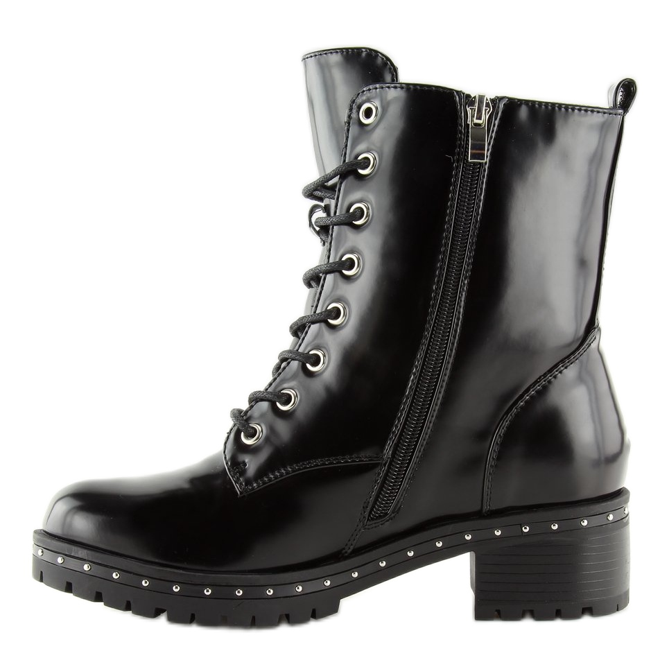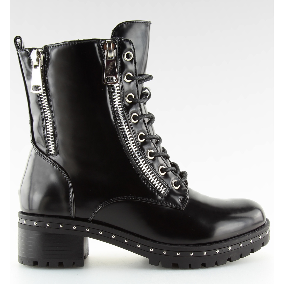 As botas femininas pretas A-40 pretas são a escolha perfeita para mulheres que desejam adicionar um pouco do estilo rock ao seu guarda-roupa. Feitos inteiramente de couro ecológico de alta qualidade, estes botins apresentam um atraente acabamento envernizado. As atraentes tachas ao longo da sola e os fechos decorativos prateados são detalhes que lhes conferem carácter e os fazem sobressair na multidão.
