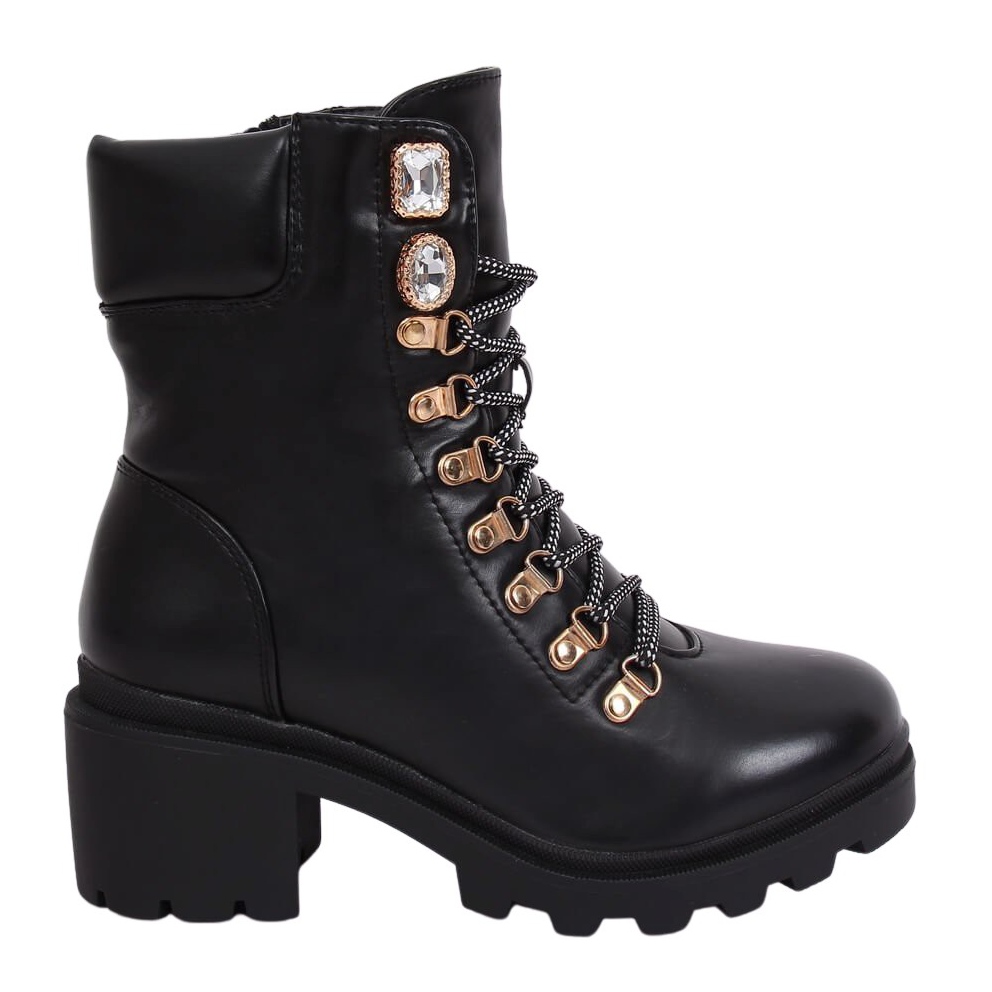 Descubra o último sucesso da temporada - as botas femininas pretas HE110 Black, que são o complemento perfeito para qualquer estilo do dia a dia. Estes sapatos de trabalho extremamente modernos, com salto largo de 6 cm de altura, combinam conforto e estilo único. O seu carácter original é realçado pelos laços dourados com atacadores contrastantes, que acrescentam energia a cada look, e as pedras brilhantes no topo do cabedal atraem o olhar e dão um brilho único.